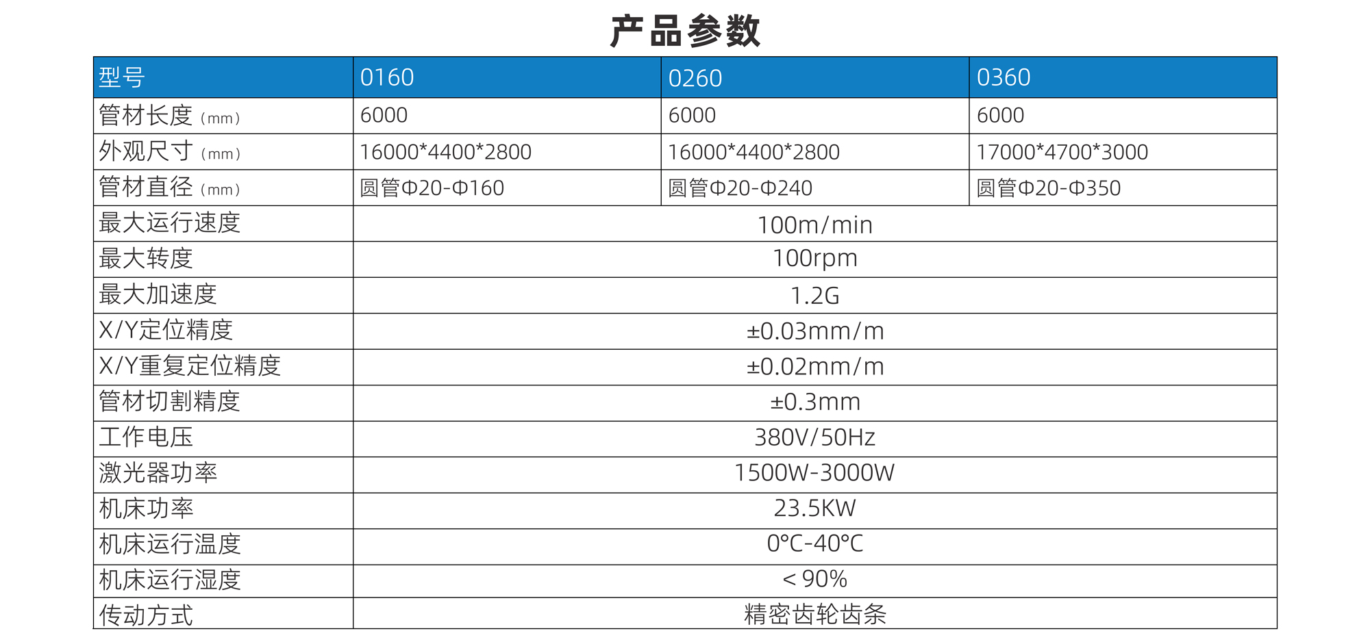 | 外觀尺寸(mm) | 16000*4400*2800 | 16000*4400*2800 | 17000*4700*3000 | 管材直徑(mm) | 圓管Φ20-Φ160 | 圓管Φ20-Φ240 | 圓管Φ20-Φ350 |